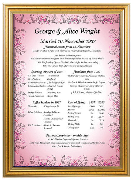 Relive the magic of your special day with our "Day You Were Married" print. This A4 sized, pre-framed keepsake, artfully encapsulates the essence of your wedding date, presenting a montage of historical milestones, news stories, political figures, sporting champions, and notable births.