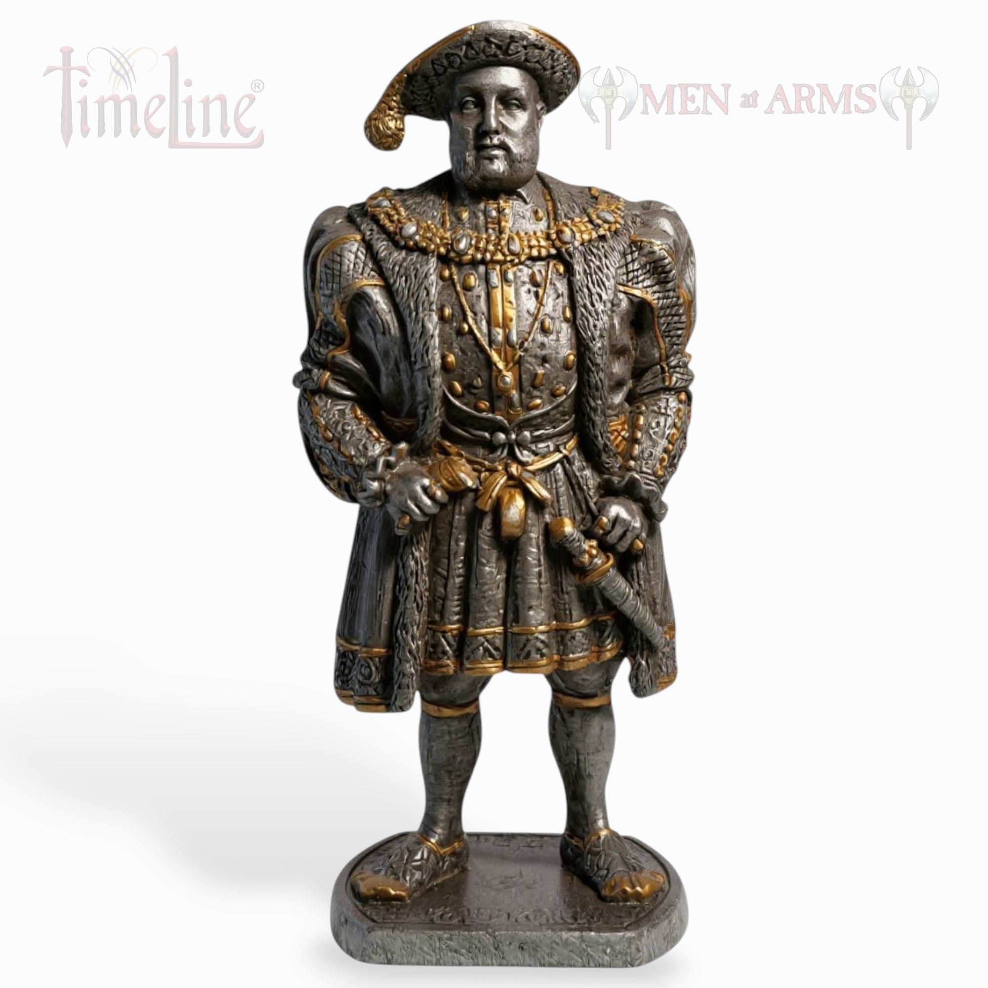 This Henry VIII decorative statue is sculpted in solid metal with a pewter finish. This is an intricately scaled model with lifelike features and highlighted details hand-painted with gold accents.