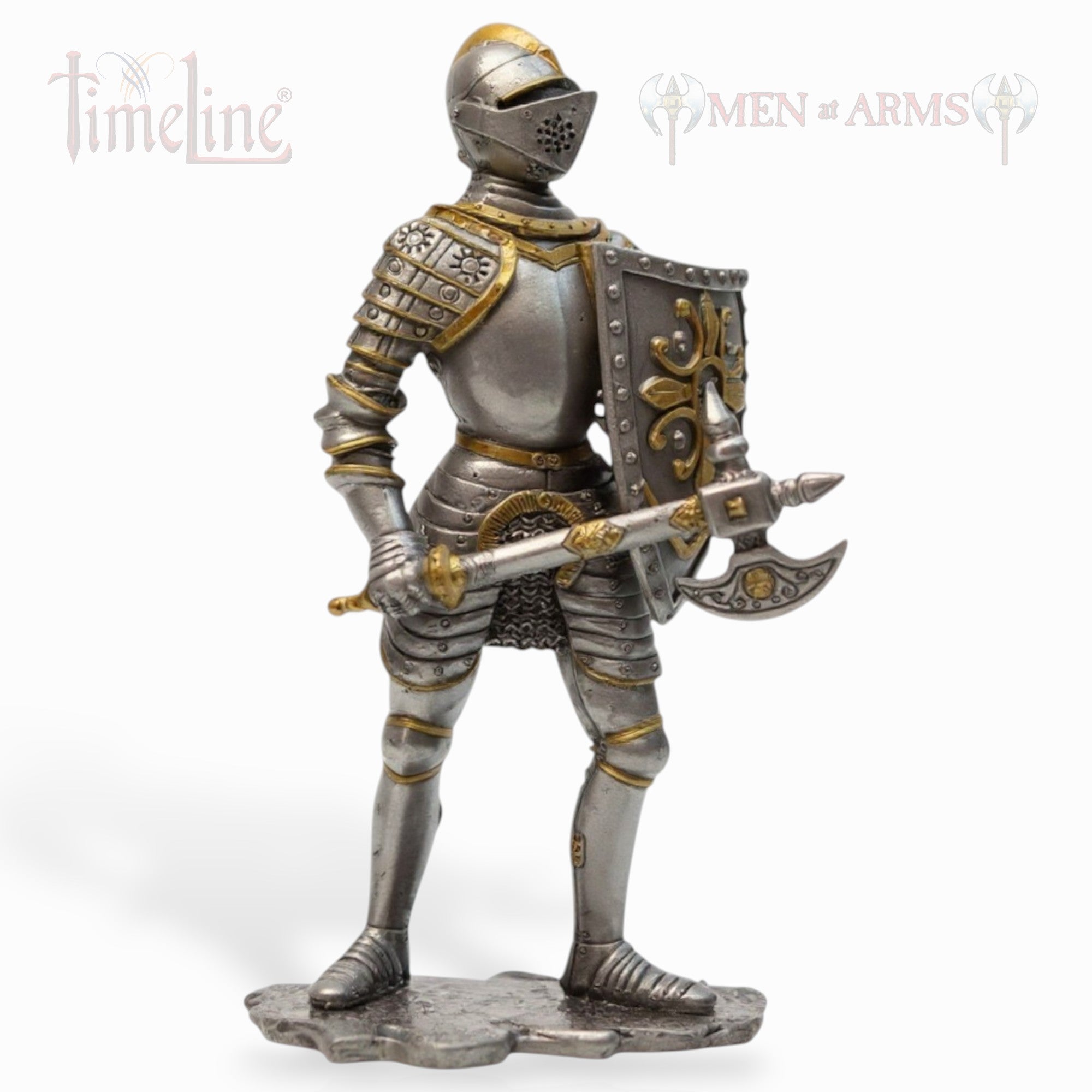 This knight is depicted in full armour carrying his shield and battleaxe. Made from solid metal, this weighty figure boasts lifelike features and intricate details. It is pewter finished with hand-painted golden accents.