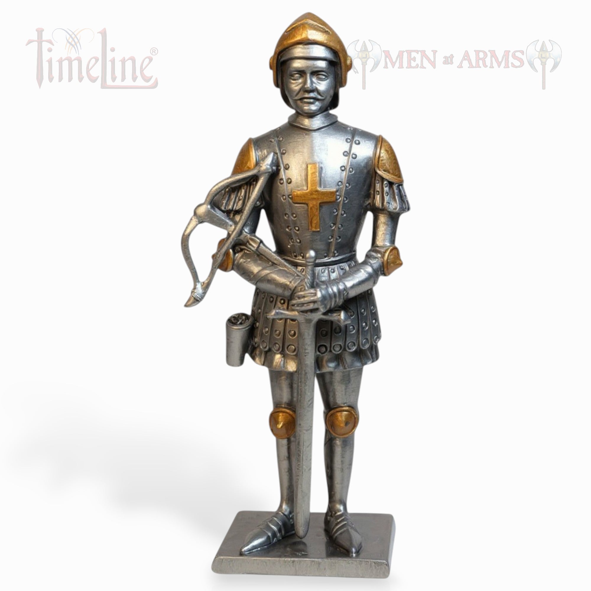 Solid metal collection by sculptress Gabriella Veronese. Highly collectable, these intricately scaled knights have been plated in pewter and painstakingly sculpted through a magnifying glass to create details such as chainmail. This is a hand-cast statue of a knight, carrying a crossbow and sword. The intricately scaled model has lifelike features and hand-painted golden accents.