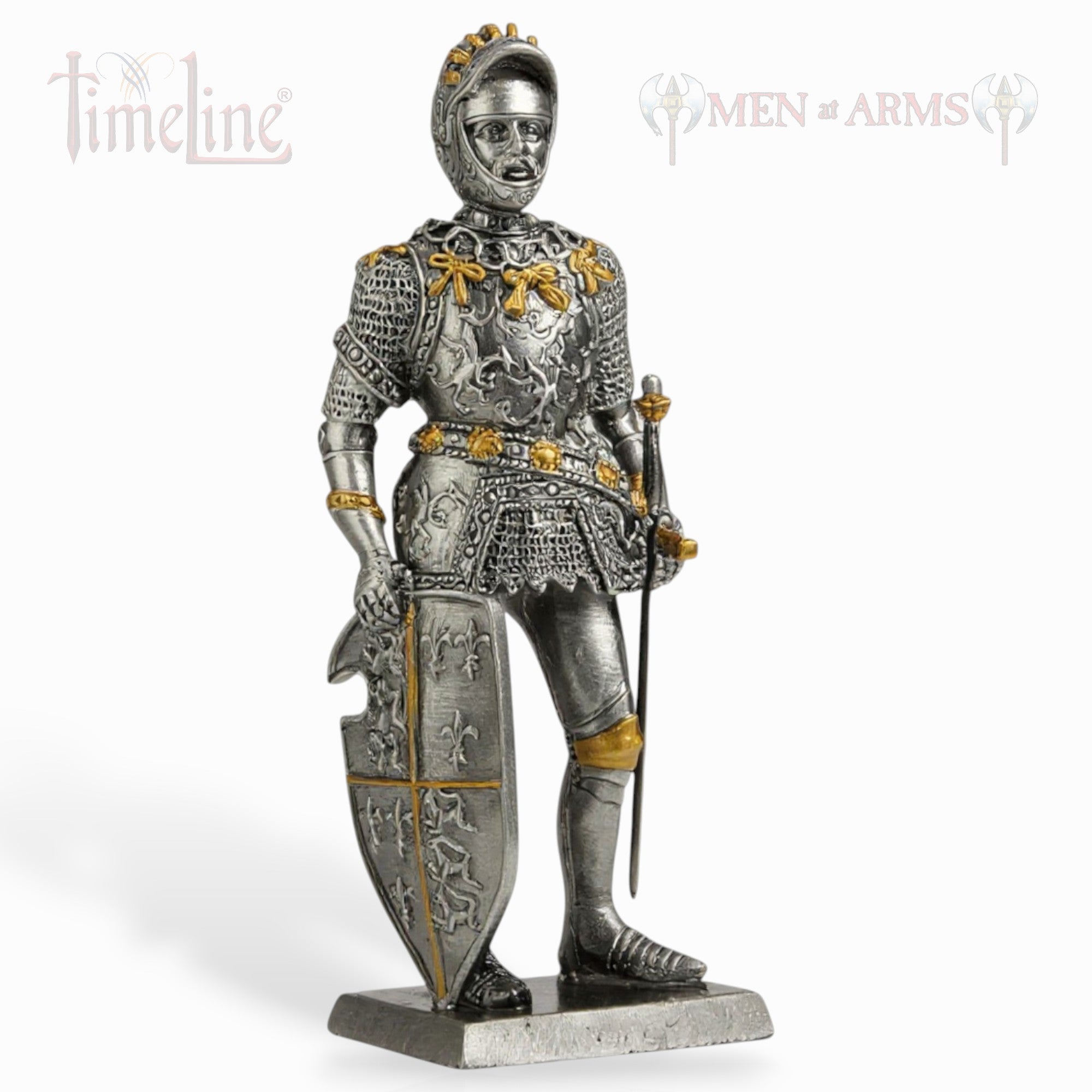 A solid metal, hand-cast statue of a knight in full armour with helmet, sword and shield. This is made from solid metal, pewter-plated and finished with hand-painted golden details.
