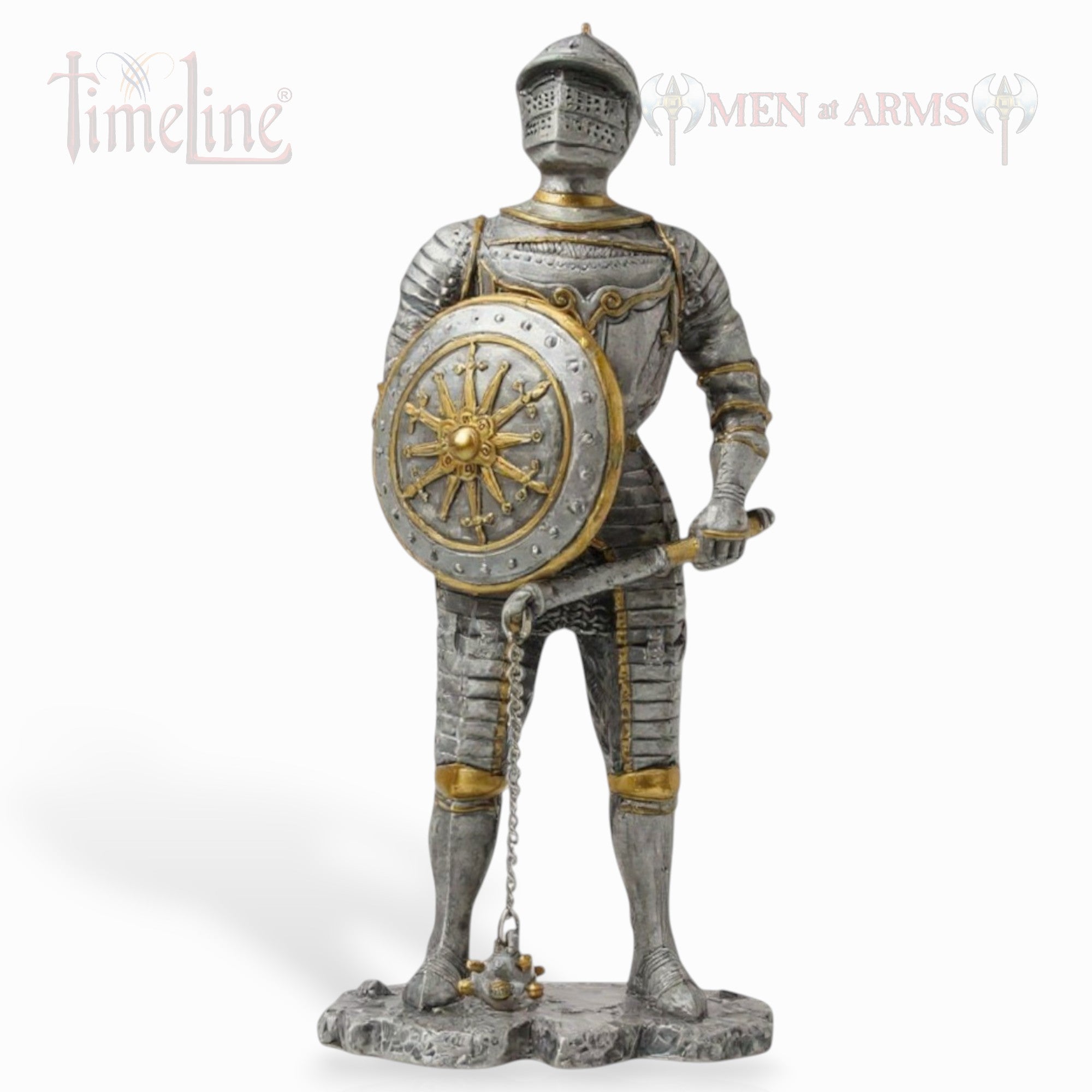 A solid metal, hand-cast statue of a circa 1500 knight, carrying a shield and flail. The flail chain moves adding extra realism. This intricately scaled model has lifelike features, is pewter-plated and finished with golden hand-painted detailing.