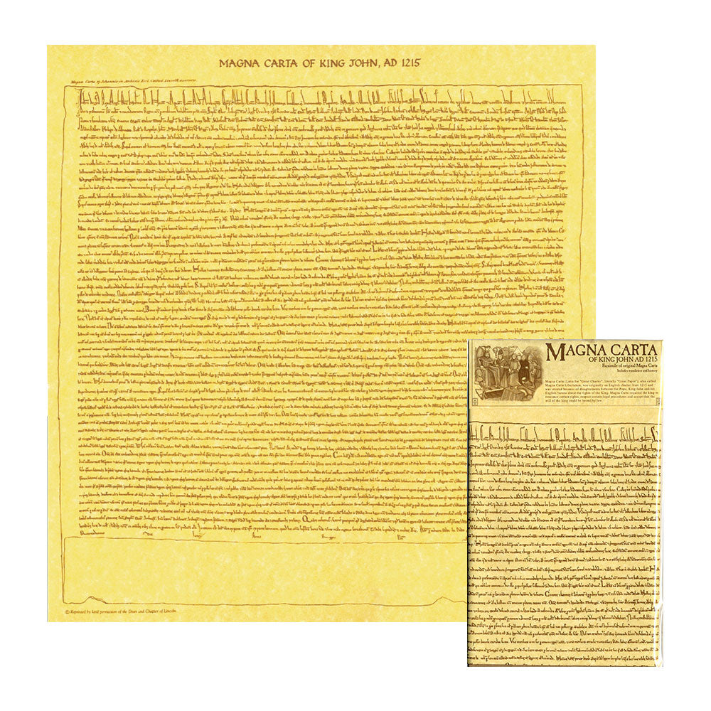 A reproduction version of the Magna Carta printed onto parchment type paper, complete with a modern day English translation.