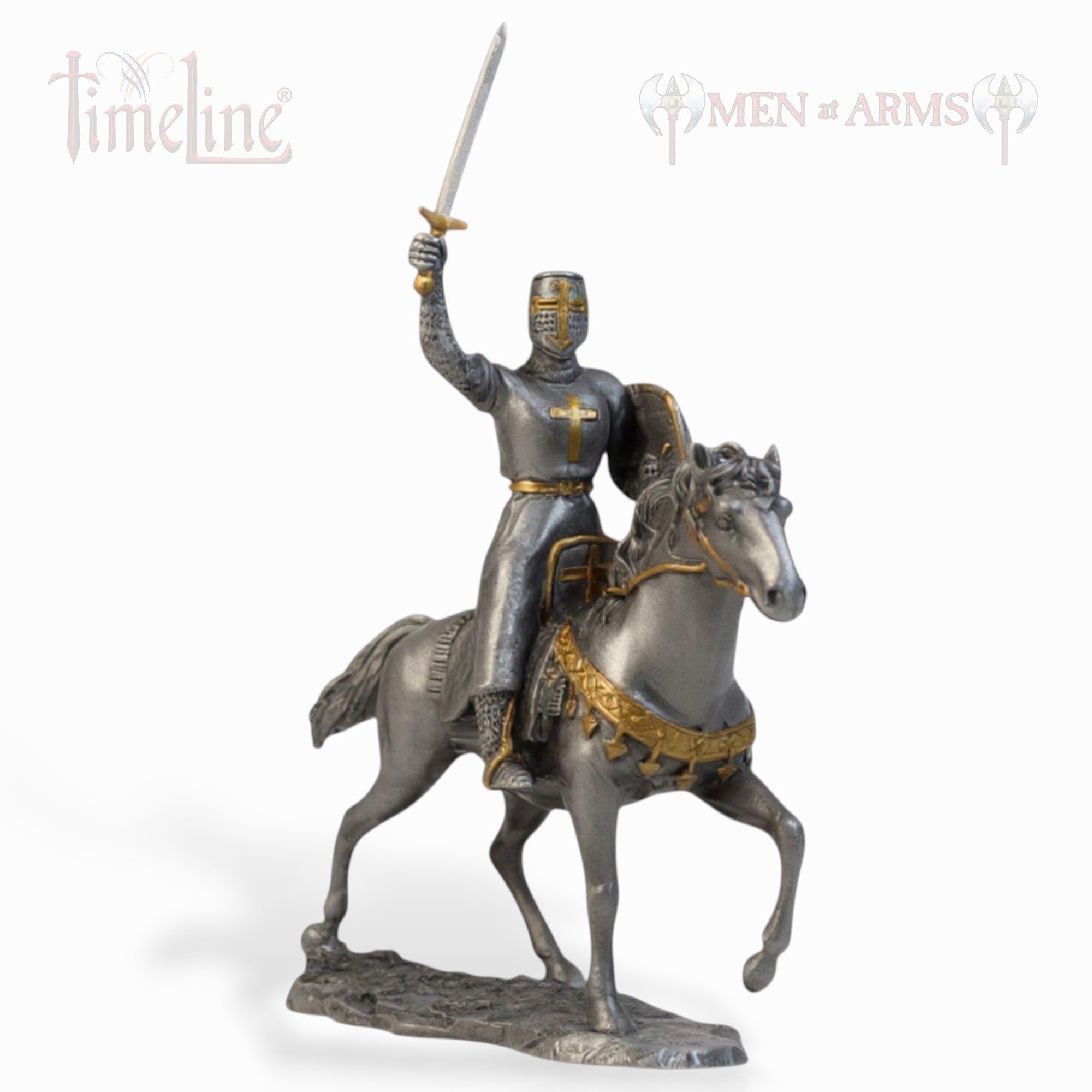 This beautifully crafted mounted knight figure is exquisitely detailed, featuring a majestic knight riding his steed while holding a lion shield. Made from solid metal, pewter-plated with hand-painted golden details, it is ideal for collectors and enthusiasts alike. This piece is a must-have for all those who appreciate the allure of medieval times.
