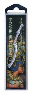 The blade typically wielded by pharaohs is a curved blade, typically made of bronze. It had ceremonial value and was typically buried alongside those of importance. This pocket-sized piece of history is hand cast in lead-free pewter and comes in a display case detailing information on the ancient tool of war.