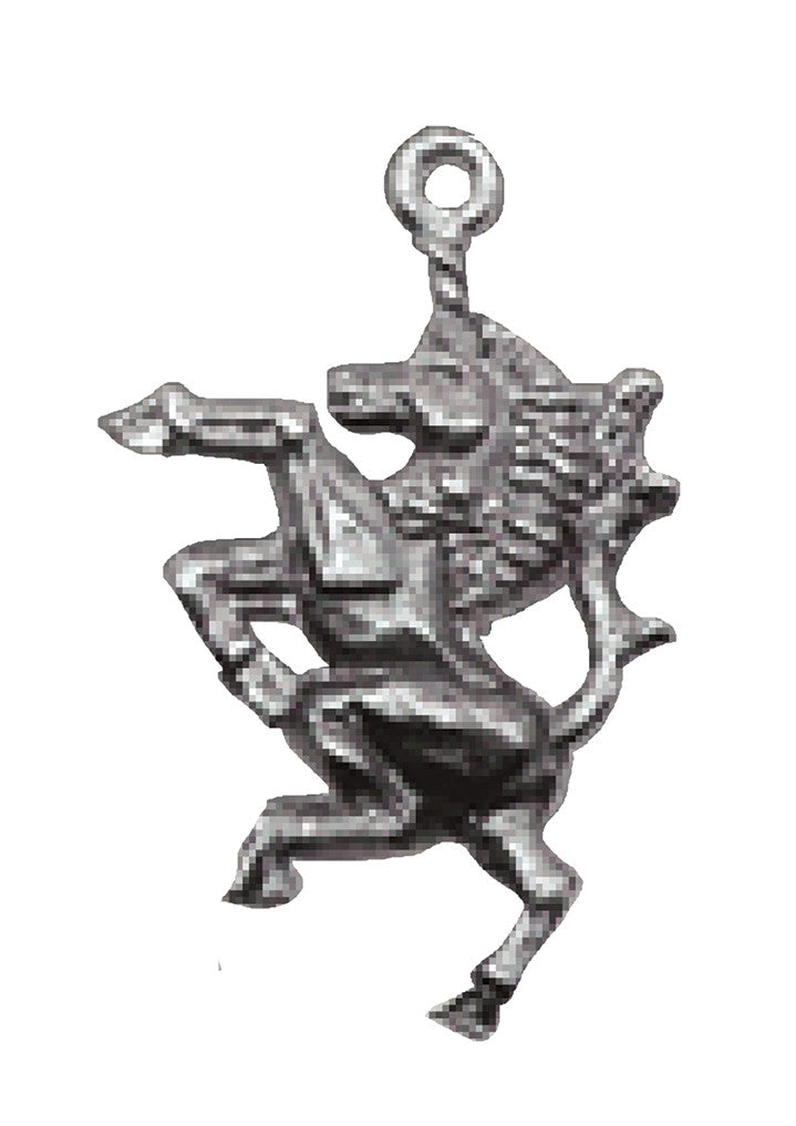 A pewter pendant featuring a unicorn, a whimsical piece that captures the imagination.