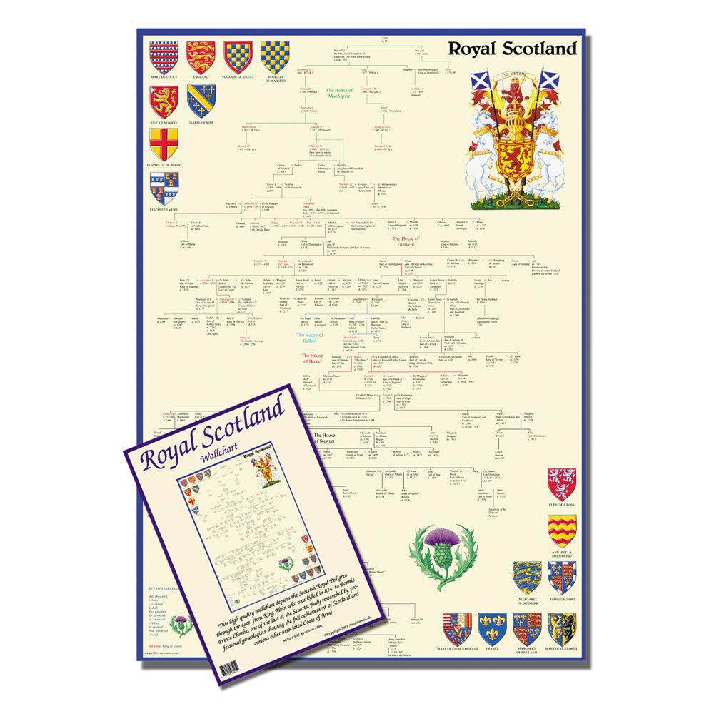 The family tree of the Kings and Queens of Scotland from King Alpin to the last of the Stuarts.