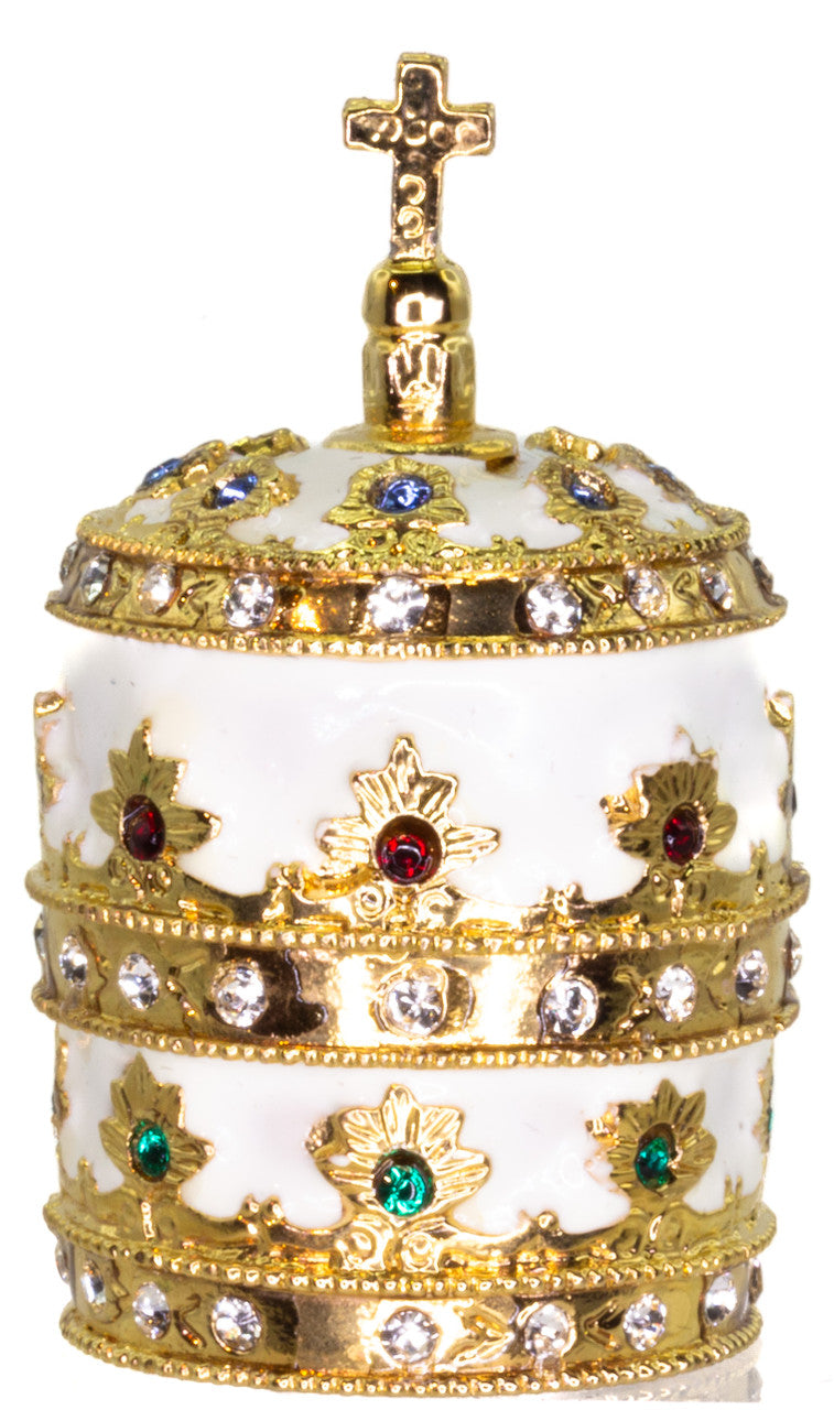 The triple tiara is richly jewelled, and enameled with 3 inscriptions glorifying the Emperor.